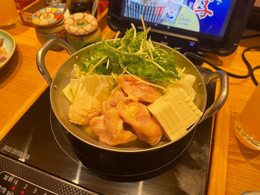 鶏肉、水菜、つくね、豆腐が入った水炊きは