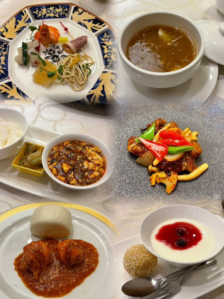 テーブルには、彩り豊かな前菜から、 フカヒレスープ 、本格四川の麻婆豆腐、ぷりぷりのエビチリ、点心、デザートまでずらり🍽️