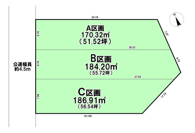 土地面積 186.91㎡(56.54坪) 接道 西側(公道)幅 約4.5m 間口 約7.98m